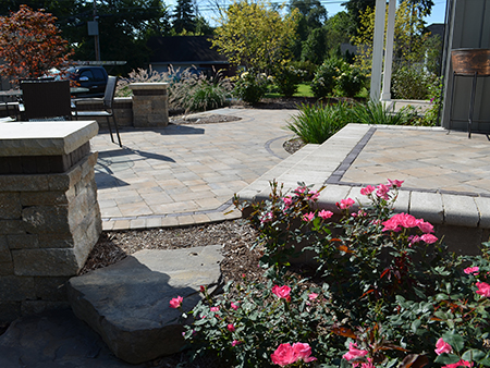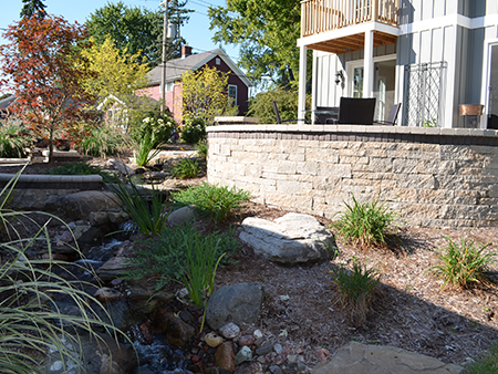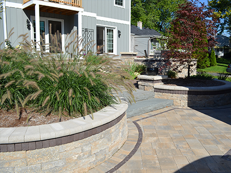 This corner lot property has a fair amount of slope which enabled us to ‘layer’ the landscaping. We used Unilock Brussels Premier Pavers for the walks, stoops, and patios. The walls were constructed of Unilock Estate Wall System. Throughout the landscape, the use of landscape stone was used as accents, steps, pathways, and a stunning water feature. Landscape Creations is an Authorized Unilock Contractor.